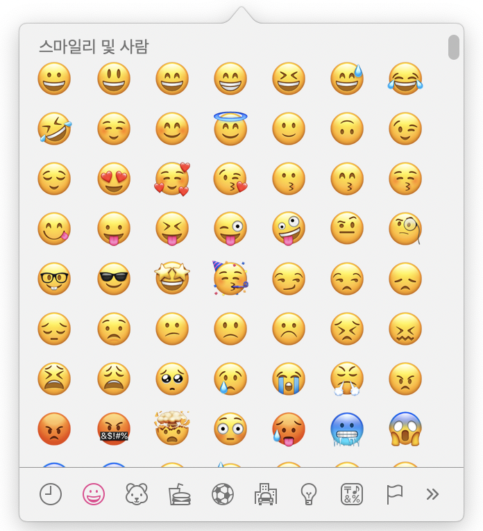 여러 가지 표정, 동물, 음식 등 아이폰에서 사용하는 이모티콘과 동일하게 다 사용할 수 있어요