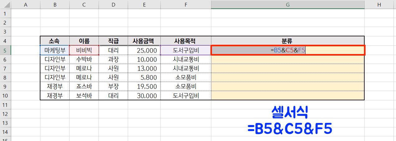 여기서 B5 C5 F5는 셀의 번호이기 때문에 매번 달라진다는 점!